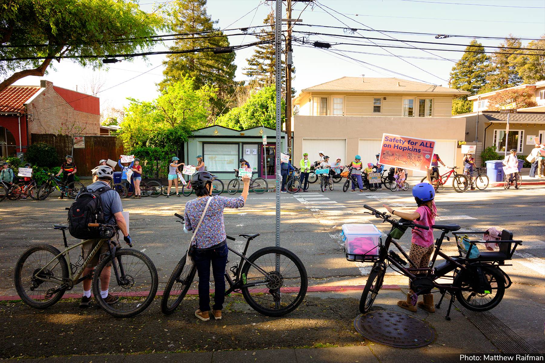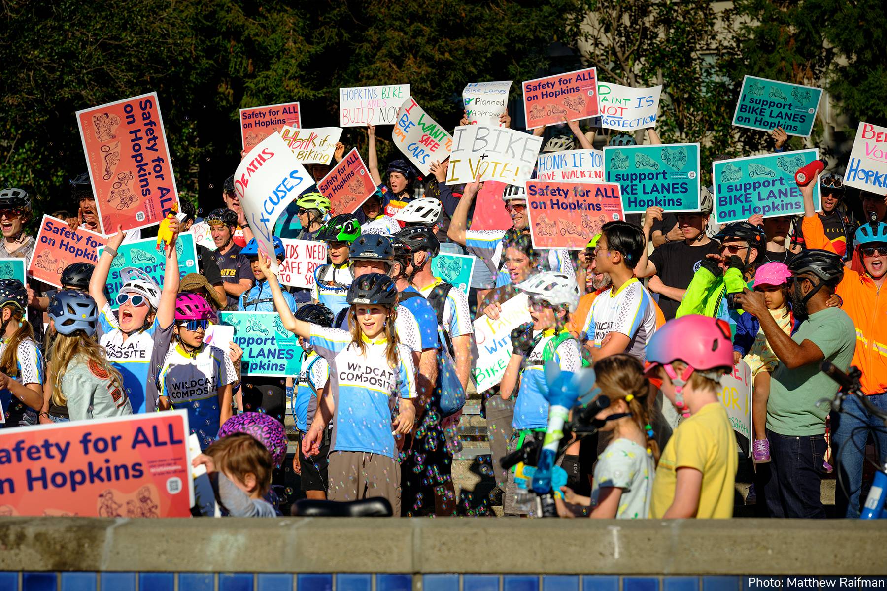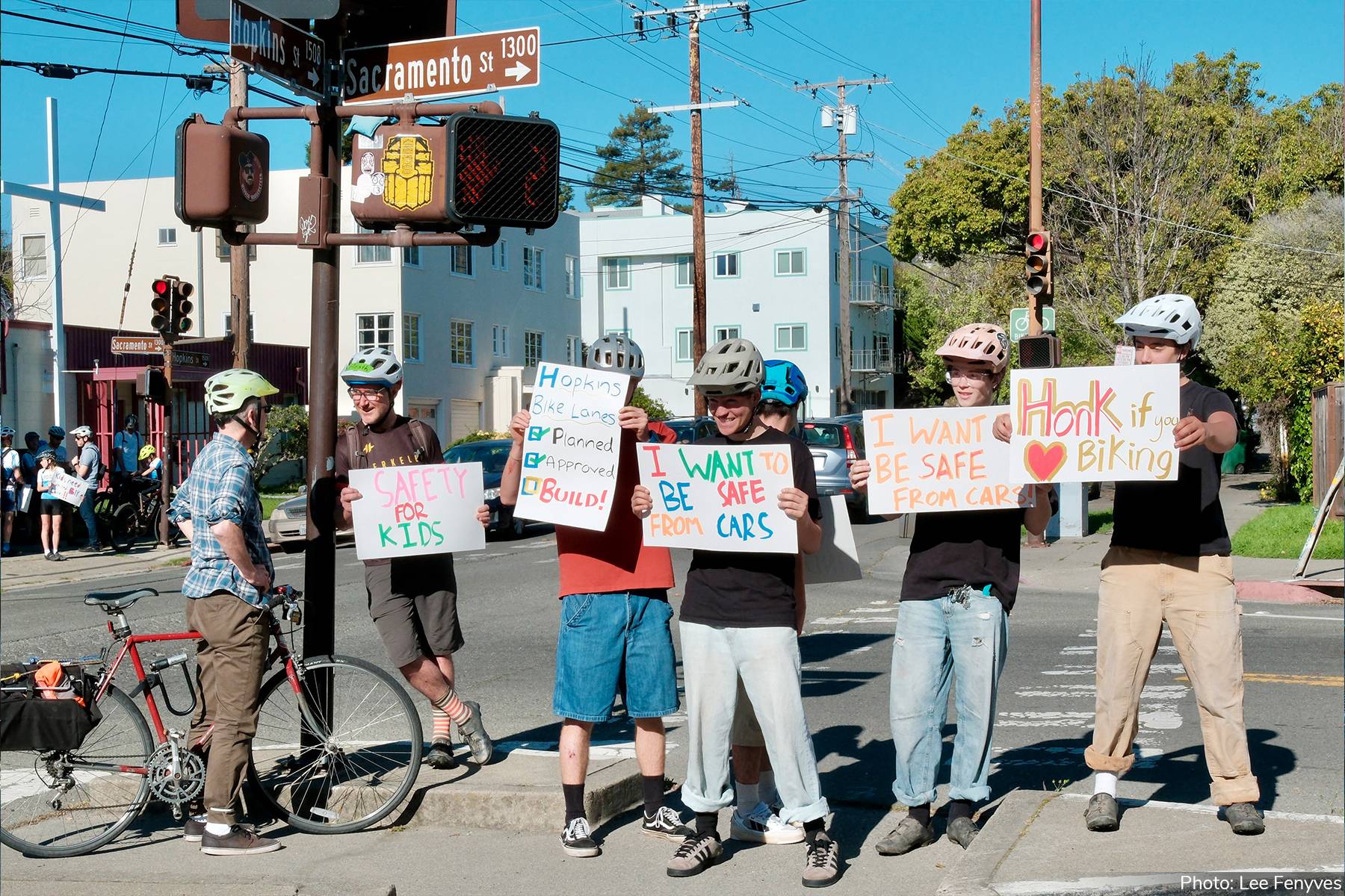 Previously, if you requested a Hopkins yard sign then you received email updates from Libby via her personal email address, but copy-pasting over 400 email addresses into the BCC field was becoming cumbersome, so we're going to be using this service moving forward. If you showed up for Hopkins bike lanes on March 12: THANK YOU! If you couldn’t make it, here’s a recap: On Thursday afternoon, March 12, more than 200 students, families, and community members of all ages assembled on Hopkins Street in North Berkeley to demand the City of Berkeley follow through on its already-approved plans to upgrade Hopkins with new protected bike lanes and improvements for pedestrians and transit riders. The demonstrators cheered, danced, blew bubbles, and held up signs to express strong community support. The atmosphere was festive, but the message was serious: protected bike lanes on Hopkins are essential for equitable street safety. They will ensure safe passage to school for children, improve the shopping experience for local businesses, and reduce vehicle speeds — making the street safer for everyone. The community is aghast that Berkeley City Council members O’Keefe and Kesarwani are proposing to repave Hopkins without the planned bike lanes. The proposal ignores hundreds of thousands of dollars and over a year spent on planning, meetings with local residents and business, and public engagement. We will not allow this vital work and investment to be dismissed. We will continue pushing to ensure the community gets the bike safety improvements that we deserve on Hopkins and across Berkeley. Stay tuned for updates on our next actions - meetings, bike demonstrations and parties, and more! Check out this Hopkins information handout* for more information and use #BikeSafeBerkeley when you post on social media about Safety for ALL on Hopkins. ​ |